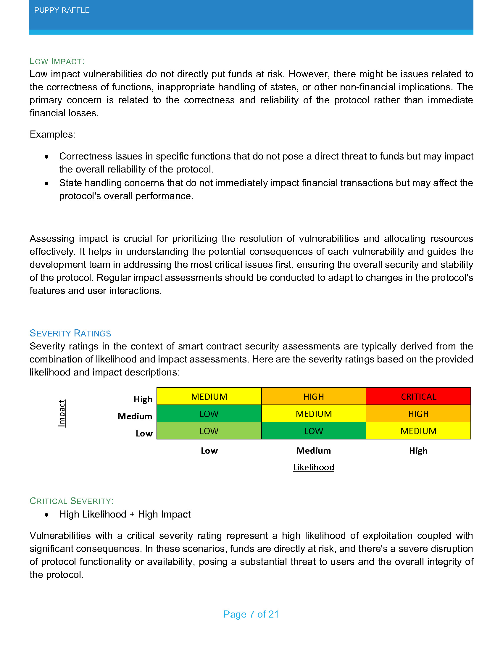 This report's findings differ from the official one with respect to severity ratings assigned. Two of the findings in the course were labeled "High Severity". However, since both the likelihood of exploitation and financial impact were deemed high, those vulnerabilities were labeled "Critical" in my report.